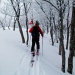 Meet Mr Inoue-san, the owner of Seki Onsen, in his crazy little office. He arranges us a guide, with a little flag on the end of a piece of bamboo. We take a long hike above the resort, through pristine birch forest, before blasting back down.